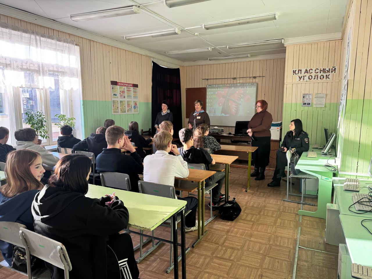 В ходе мероприятия инспектор по делам несовершеннолетних рассказала ребятам о правах, обязанностях и ответственности несовершеннолетних за совершаемые правонарушения, о возрасте, с которого наступает административная и уголовная ответственность, затронули тему склонностей к зависимостям, разрушающим здоровье.
